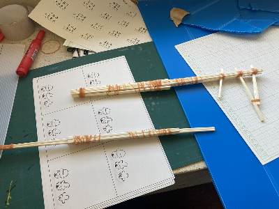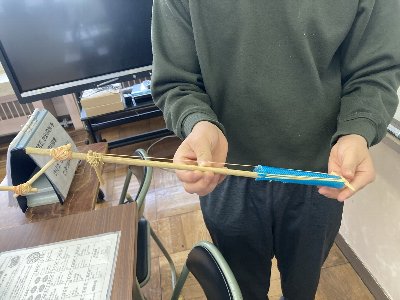 ゴム銃なのですが、もちろん輪ゴムを発射できます。 それで、作ったものが「大きい」ので、持ち運びに困る、と考えたらしいんです。 それで、ふたつに分割できるようになっています(笑)。