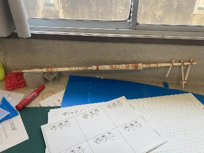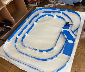 ゴムホースの切れ端をスライドさせると、次の輪ゴムがセットされます(笑)。 普通、思いつきませんよね? 普通は思いつかなくても、イメージの中でなら、思いつくことができる(映像化できる) んですよね。 そしたら、それを「手」を通して、作り出すことができます。 「目と手の協応」という言葉があるのですが、 「目」で見て、「手」を連動させて動かす、ということです。 「目」で見て(認知)「脳」で考え、イメージ化して、「手」を動かして作品を作り出しま す。だから、「目で見て考える」ことは、「手で考える」ことと繋がります。 「手で考える」ということはありえる、ということがわかりますね。 今年は、校舎の移転と言うことで「文化祭」というものはないのですが、校舎見学で「作品発 表」という形になっています。 それで上記の生徒(生徒は三人いますが)とは、「ミニ四駆」のコースを作りました。 ダイソーで「ミニ四駆」の300円のものが売ってあったので買ってみたのですが、彼も大好 きだったので、すぐにハマりました(笑)。 大きな段ボール(冷蔵庫)に、コースを作ったのですが、一週するだけだと面白くないので、 二週するようにして、立体交差を作りました。 実は内心、「できるかな?」と心配していたんですね。